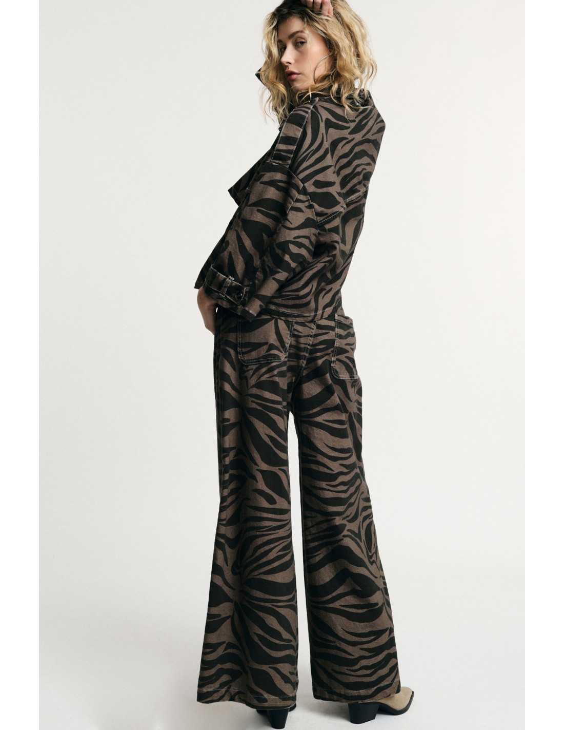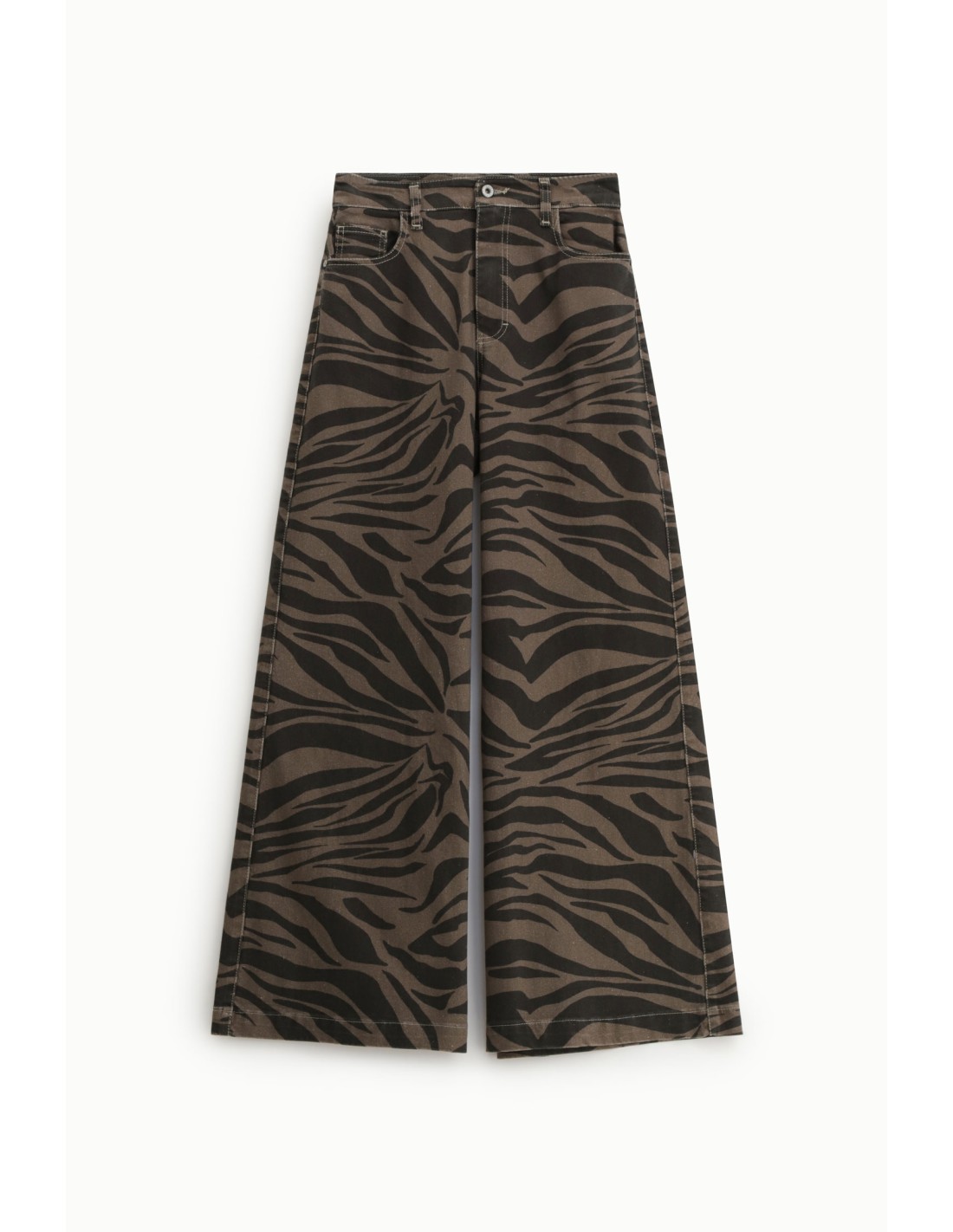 Pantalon palazzo à jambe large et taille haute, sublimé par un imprimé zèbre noir sur fond kaki. Une pièce forte pour affirmer un style audacieux au quotidien.