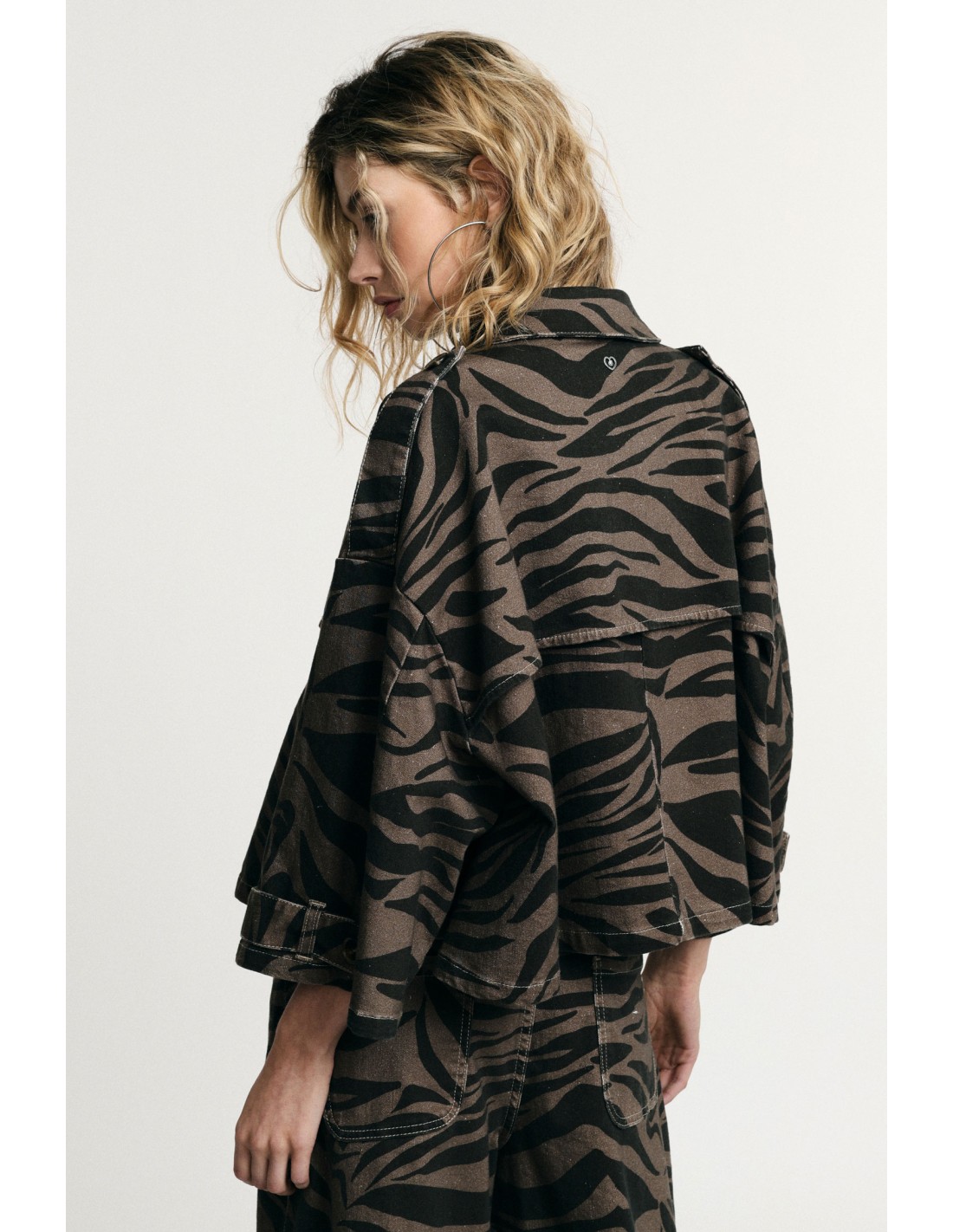Veste en denim cropped à coupe ample, dotée d’une poche poitrine oversize et d’un imprimé animalier. Une pièce forte pour dynamiser les looks urbains du quotidien.