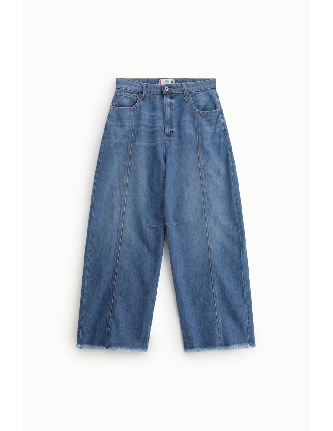 Jean à jambe large et coupe droite, longueur cheville, rehaussé de coutures apparentes et d’un ourlet effiloché. Une pièce urbaine facile à porter au quotidien.