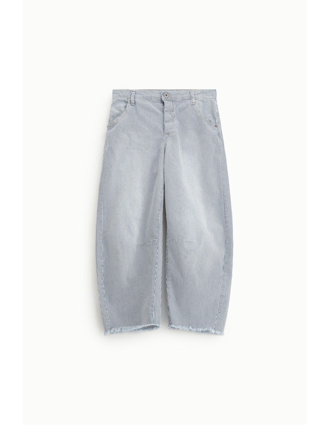 Jean coupe ballon en denim rayé bleu et blanc, ourlet effiloché et poches fonctionnelles. Une pièce urbaine de caractère, fabriquée en Italie, issue d’une gamme complète de silhouettes coordonnées