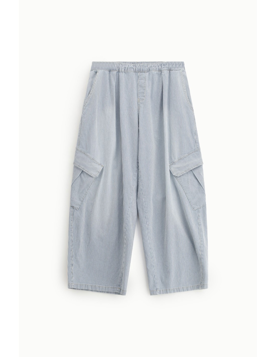 Jean large à rayures bleu et blanc, coupe ultra ample avec poches cargo latérales. Pièce forte et fonctionnelle, issue d’une gamme coordonnée, fabriquée en Italie.