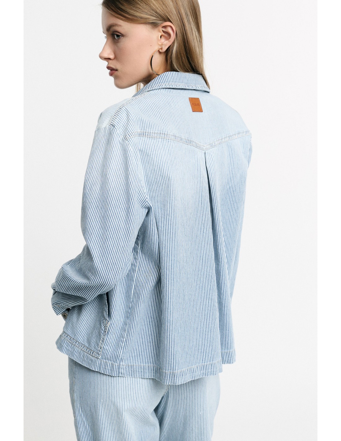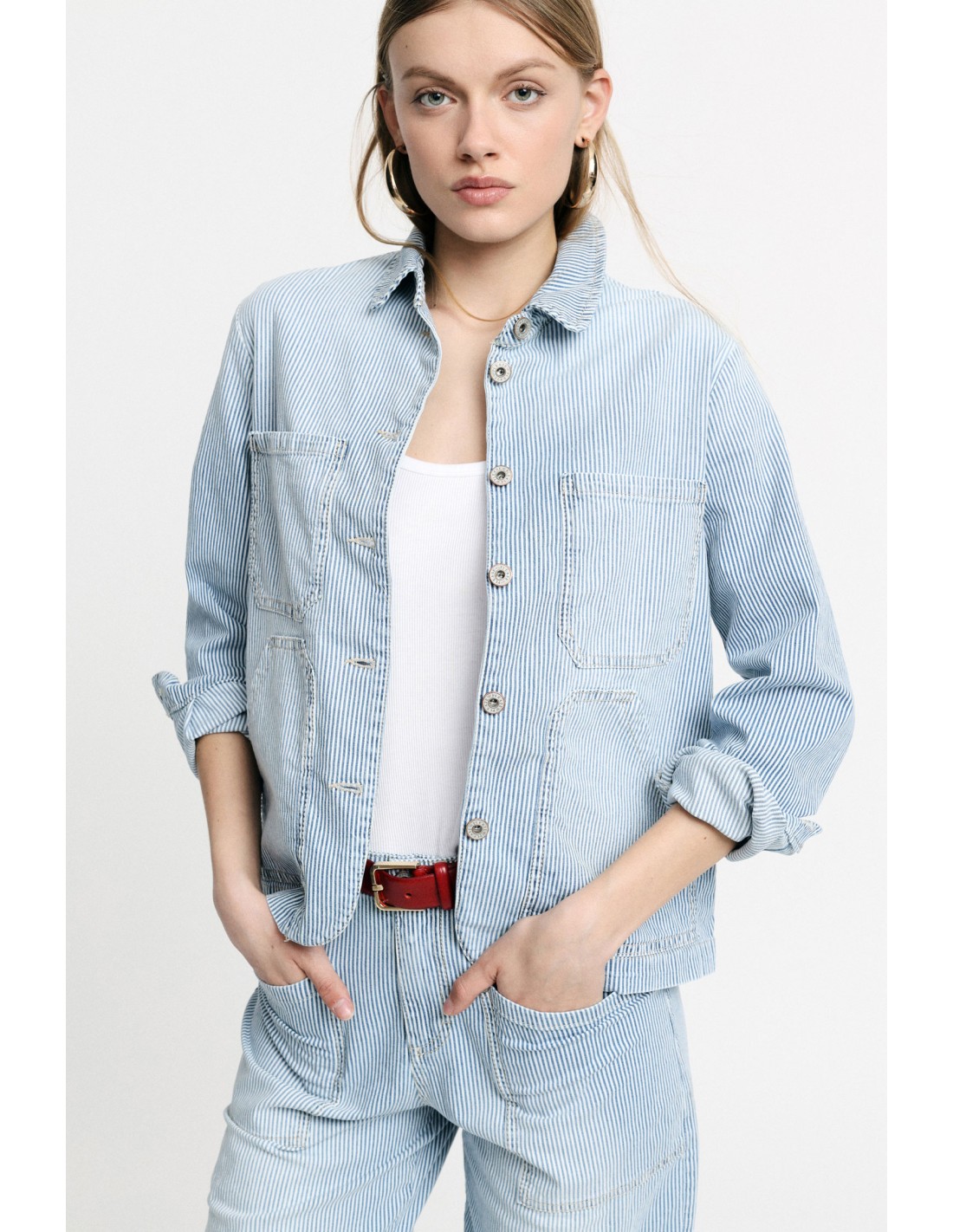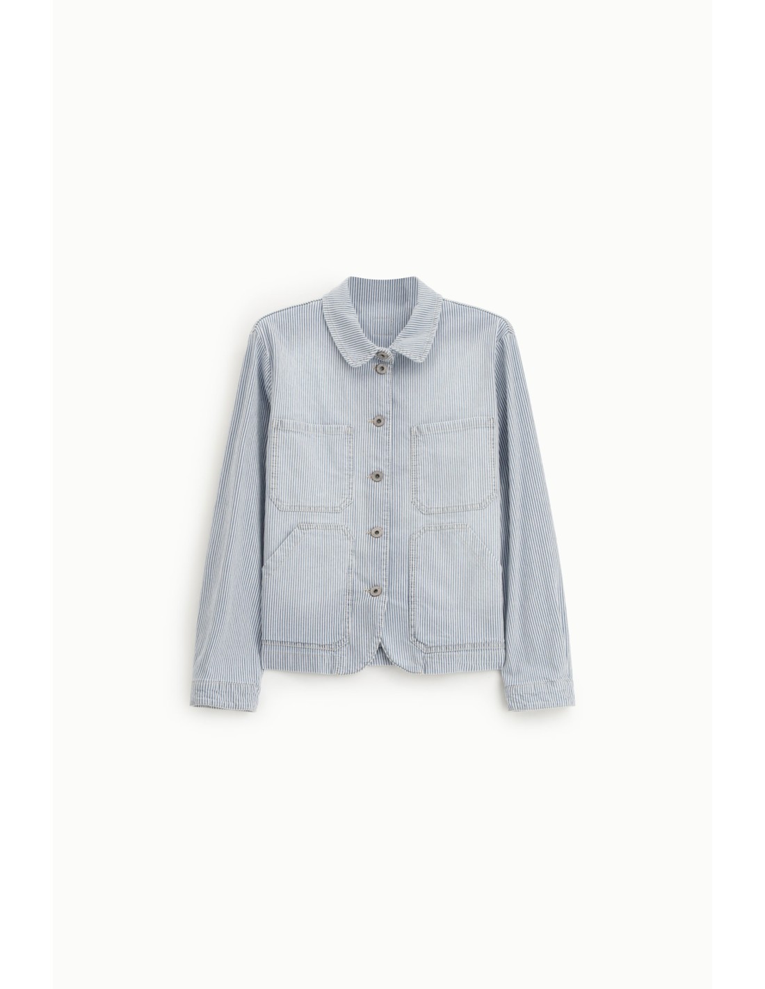 Surchemise à rayures bleu et blanc, volume droit et grandes poches plaquées. Une pièce urbaine polyvalente, issue de la même gamme coordonnée, fabriquée en Italie.
