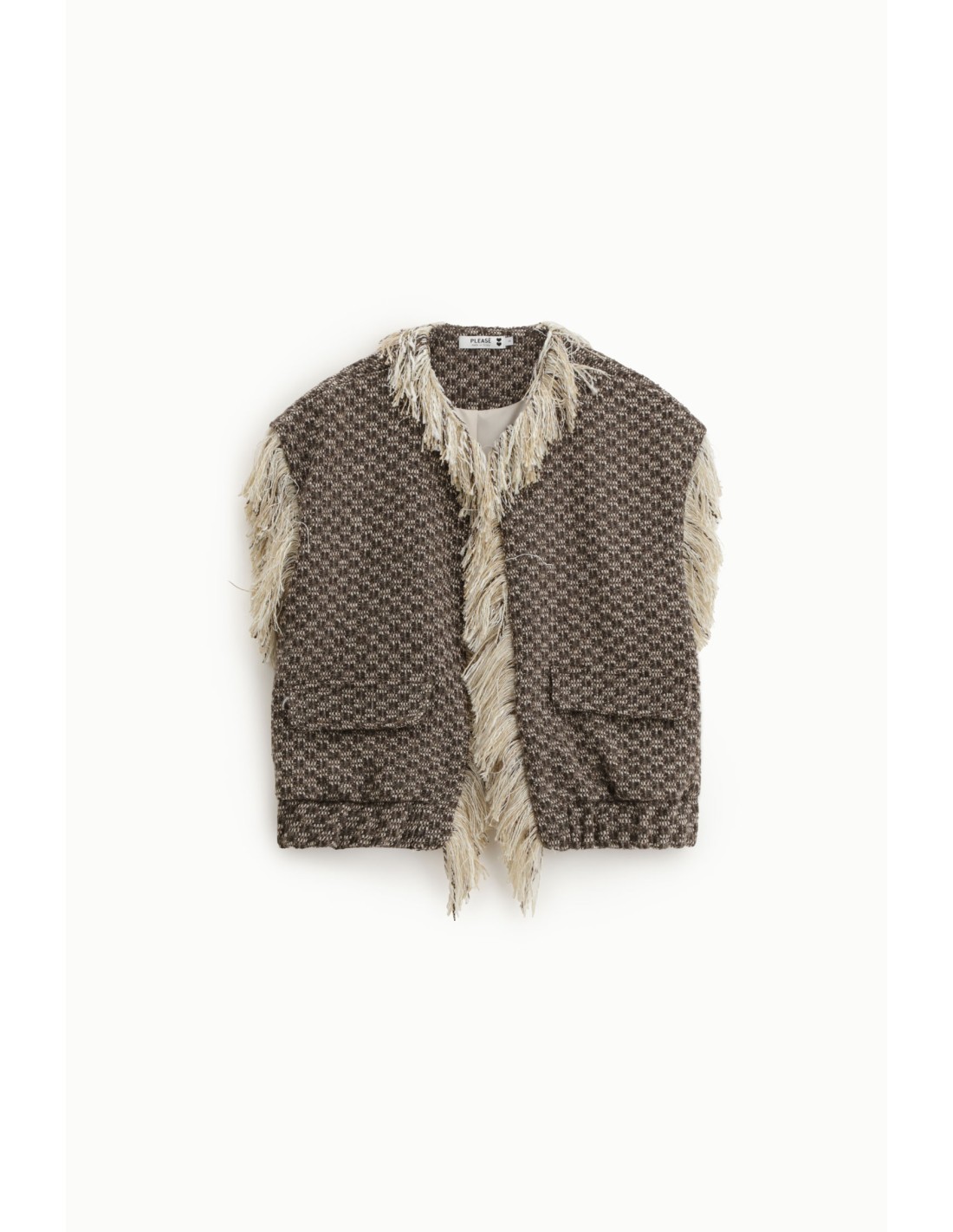 Veste sans manches Please Femme en tweed bicolore chocolat et écru, finitions à franges sur les bords et les épaules, deux poches devant. Pièce forte et texturée pour structurer et dynamiser les silhouettes.