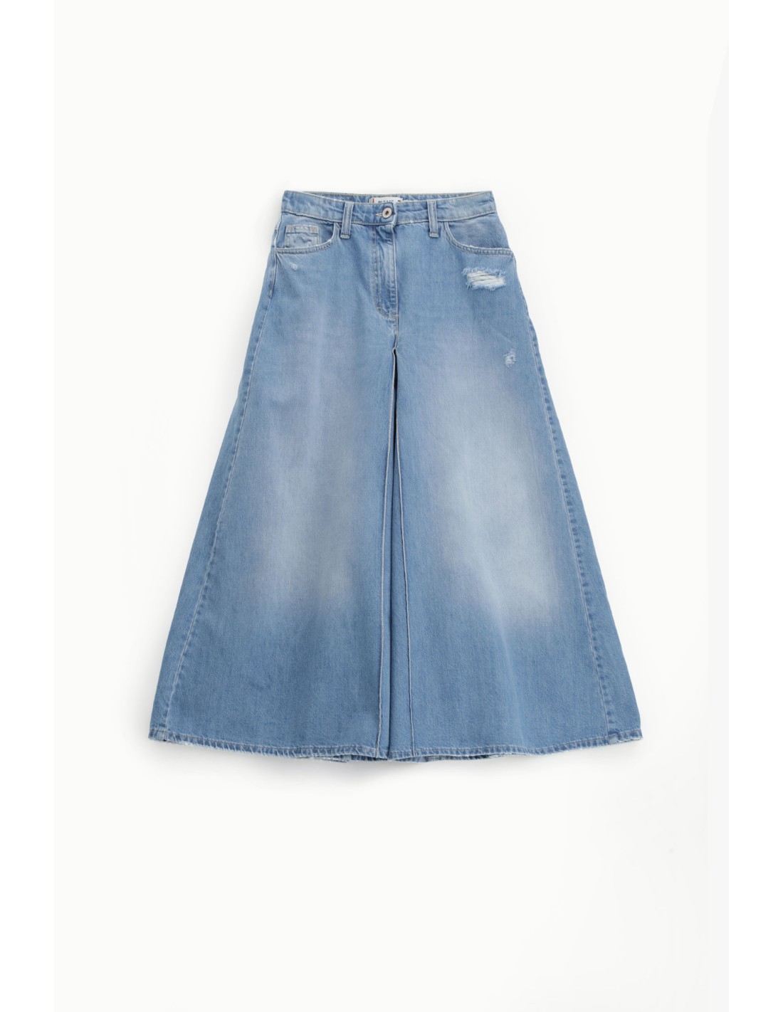 Jupe-culotte Please Femme en denim délavé, coupe large évasée avec abrasions décoratives. Une pièce forte et confortable, pensée pour composer des silhouettes affirmées au quotidien.