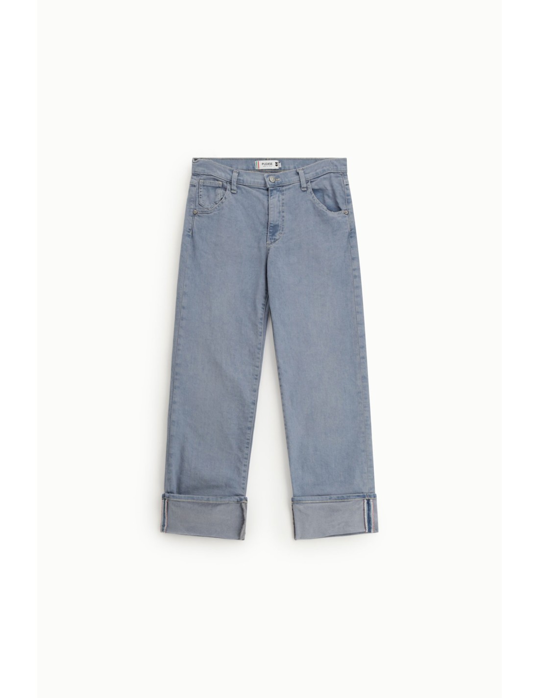 Jean Please Femme coupe droite avec large revers à l’ourlet, cinq poches et fermeture zippée. Une pièce facile à porter, pensée pour varier les styles au quotidien.