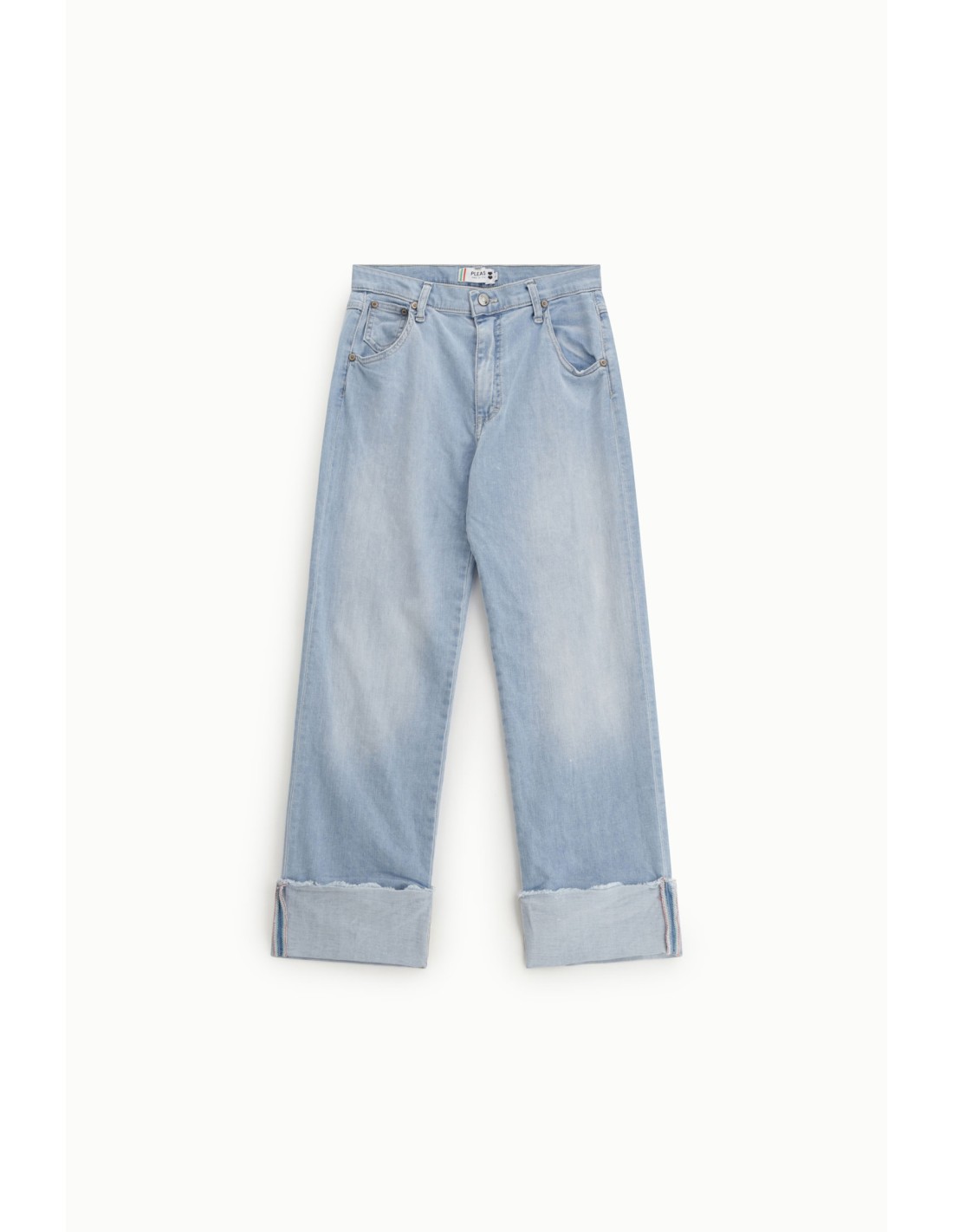 Jean Please Femme à jambe large, coupe décontractée et ourlet retourné. Denim clair délavé, silhouette facile à vivre et idéale pour le quotidien.
