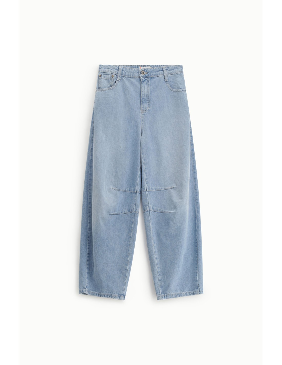 Jean Please Femme à jambe large, silhouette arrondie et coutures ergonomiques apparentes sur le devant. Denim clair délavé, pièce confortable et expressive pour le quotidien.