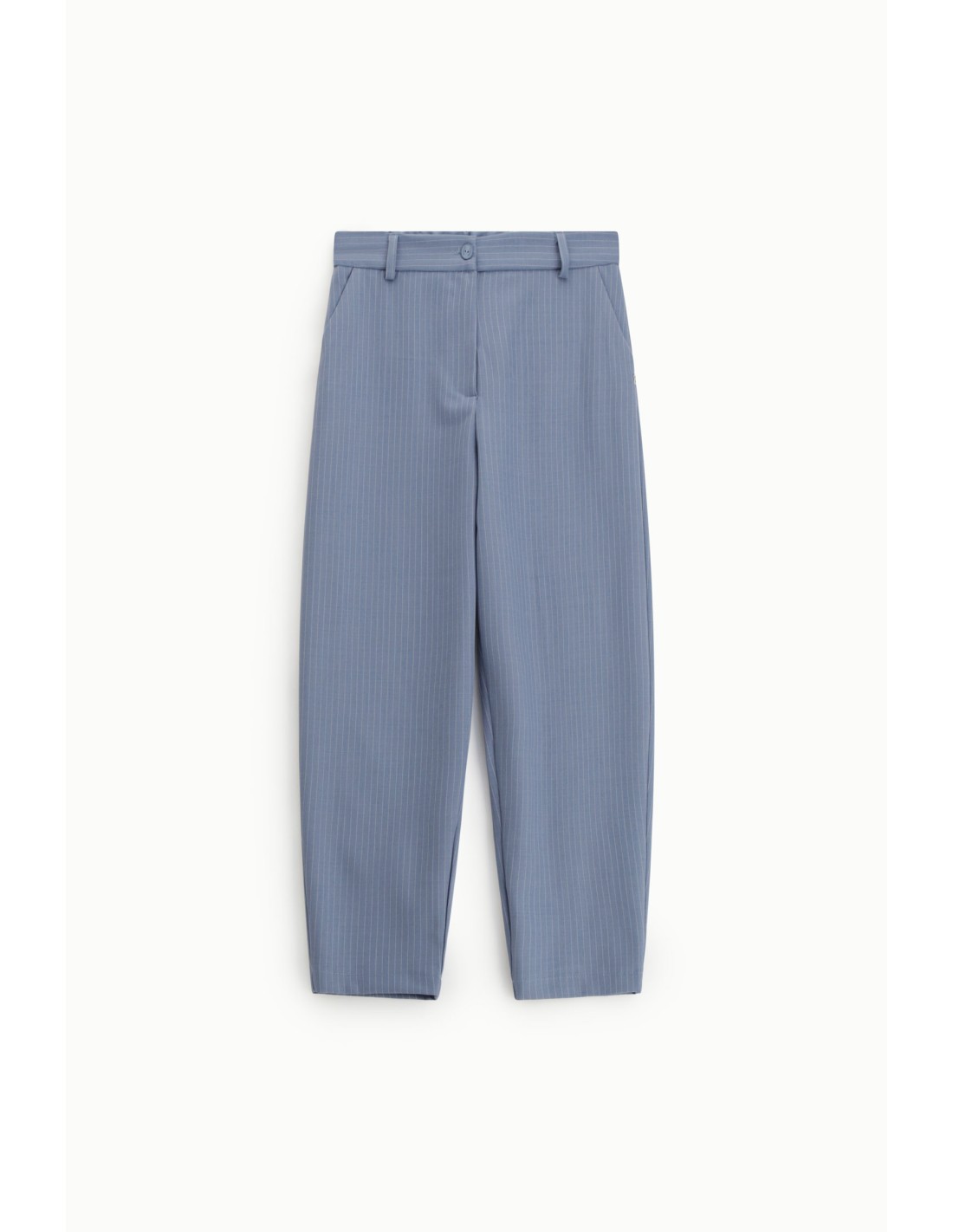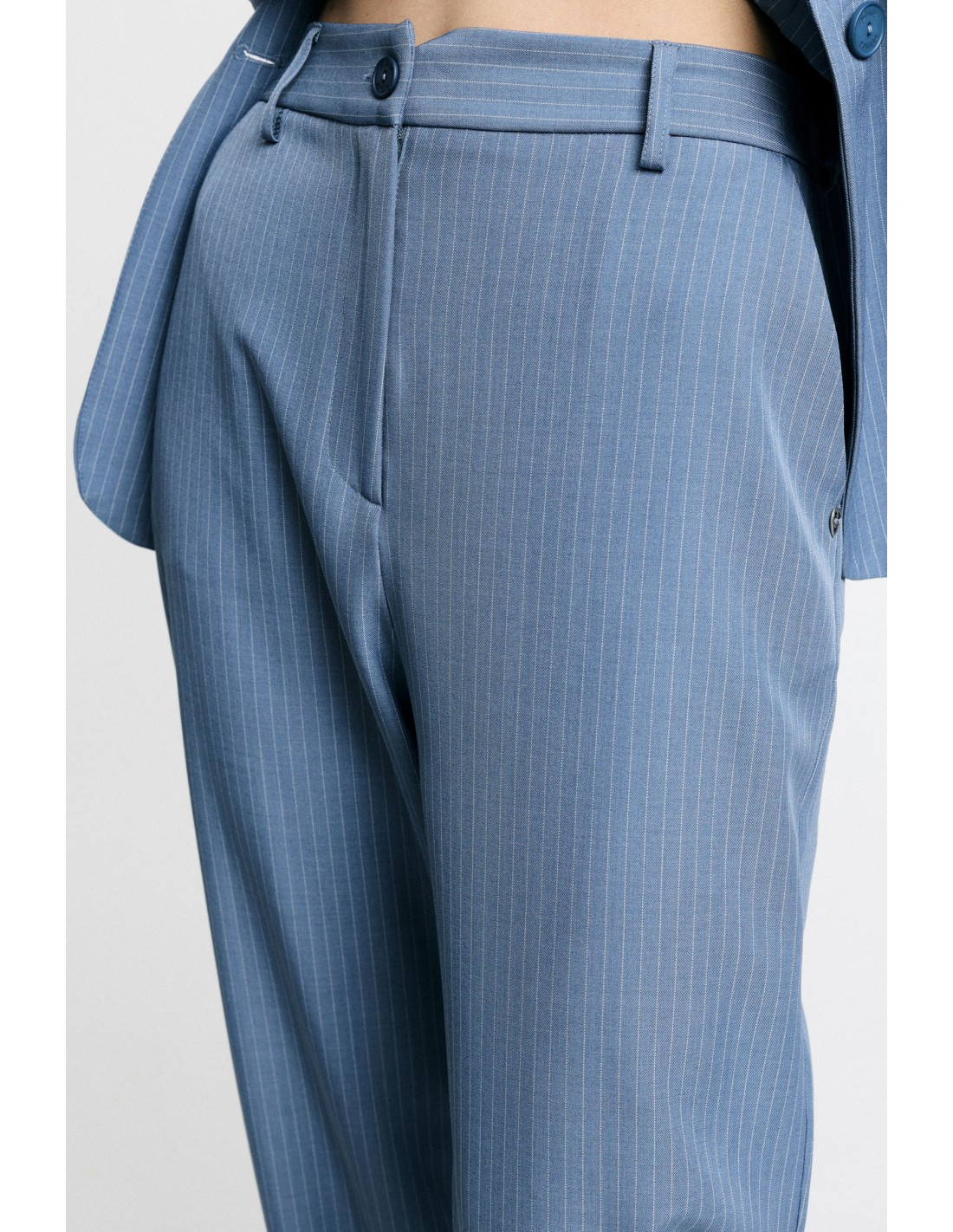 Pantalon taille haute forme tapered avec pinces et fines rayures tennis. Silhouette structurée mais confortable, parfait en tailleur coordonné ou porté seul au quotidien.
