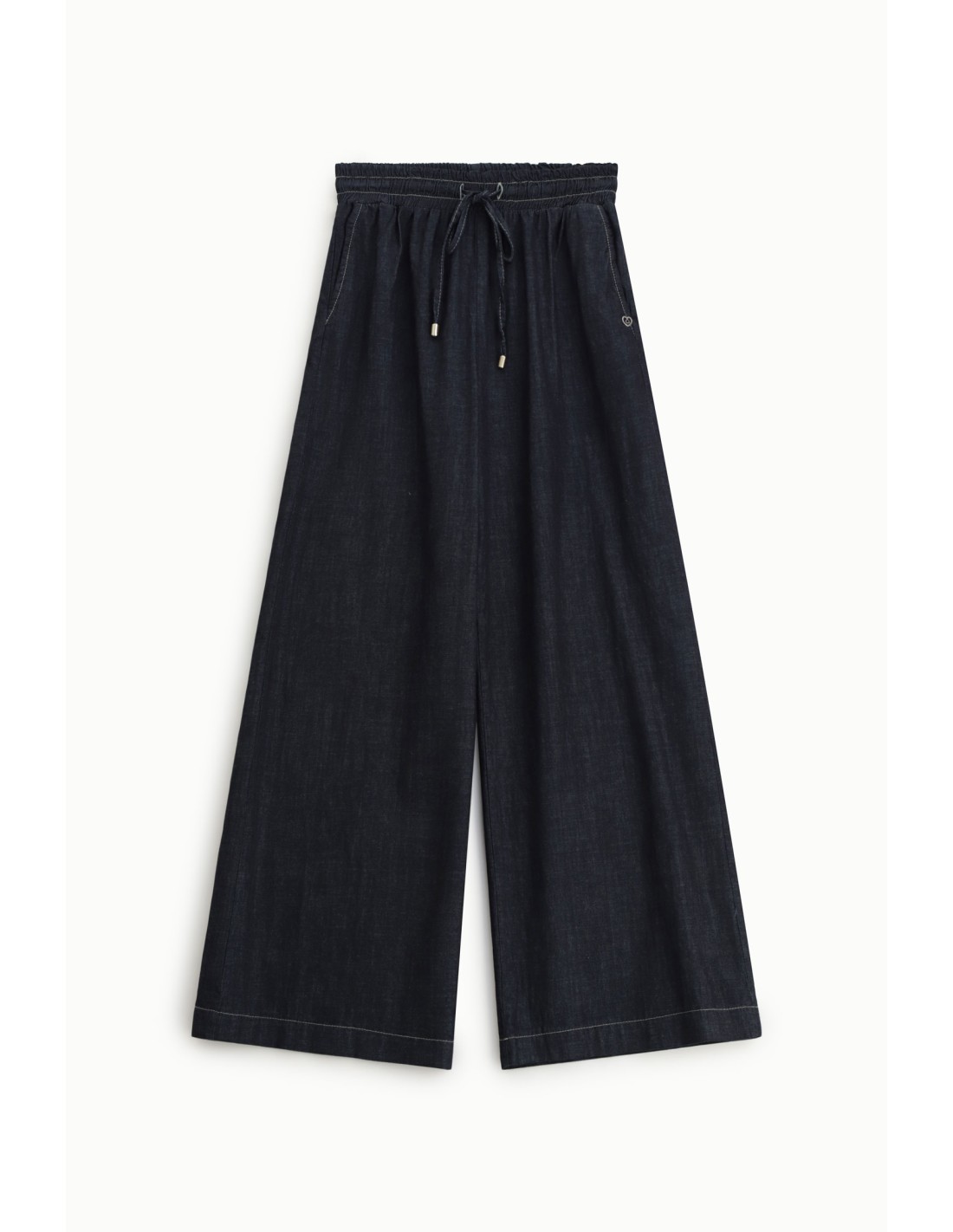 Ce pantalon palazzo revisite le denim avec une coupe ample qui libère le mouvement tout en allongeant la silhouette. La taille élastiquée avec cordon permet un ajustement naturel et confortable, tandis que les poches latérales renforcent son côté pratique au quotidien.