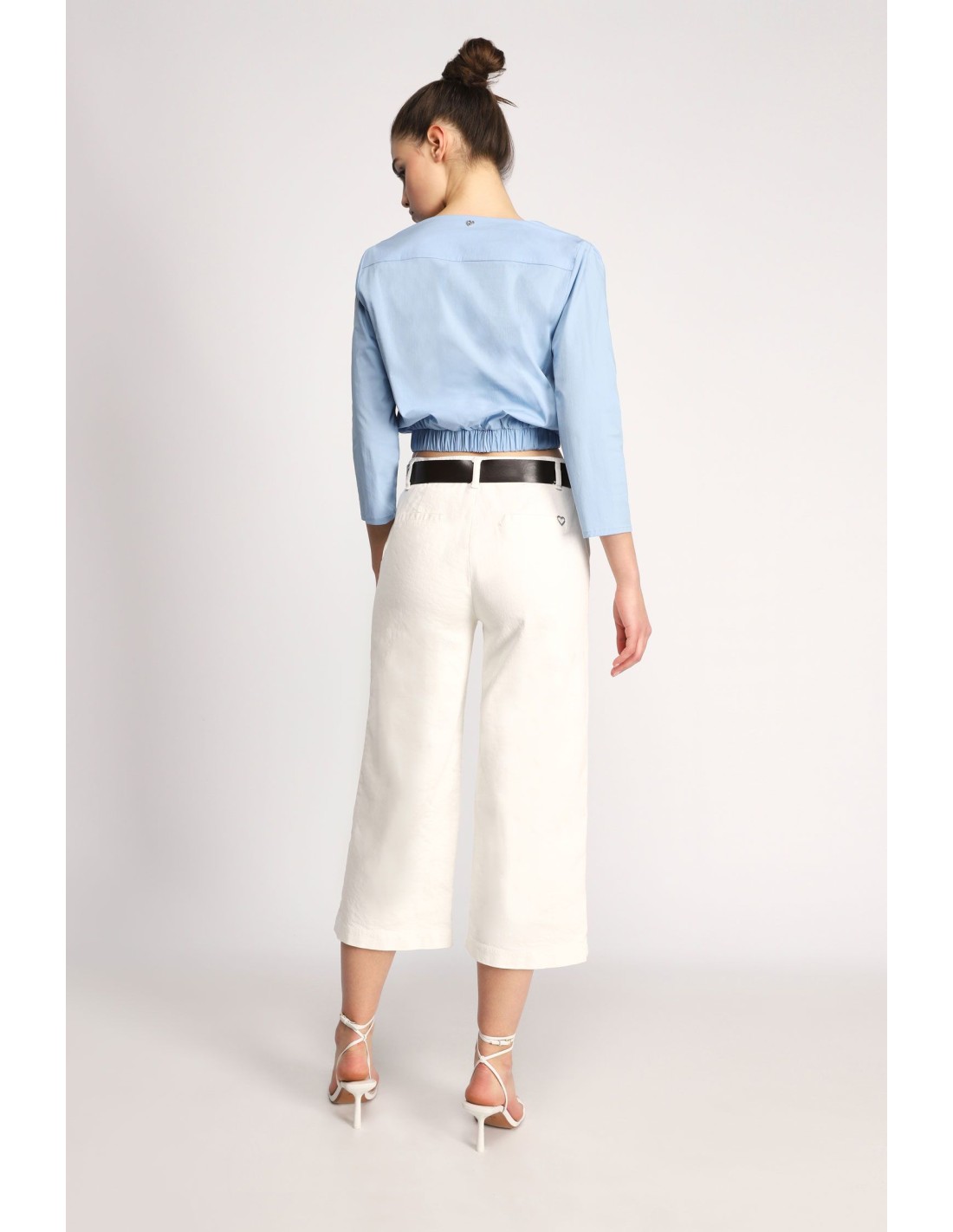 Ce pantalon chino revisite le denim avec une ligne propre et actuelle. Sa taille haute met la silhouette en valeur tandis que la longueur 7/8ᵉ apporte une touche moderne facile à porter toute l’année. La ceinture fine en simili-cuir souligne la taille et structure la tenue sans effort.