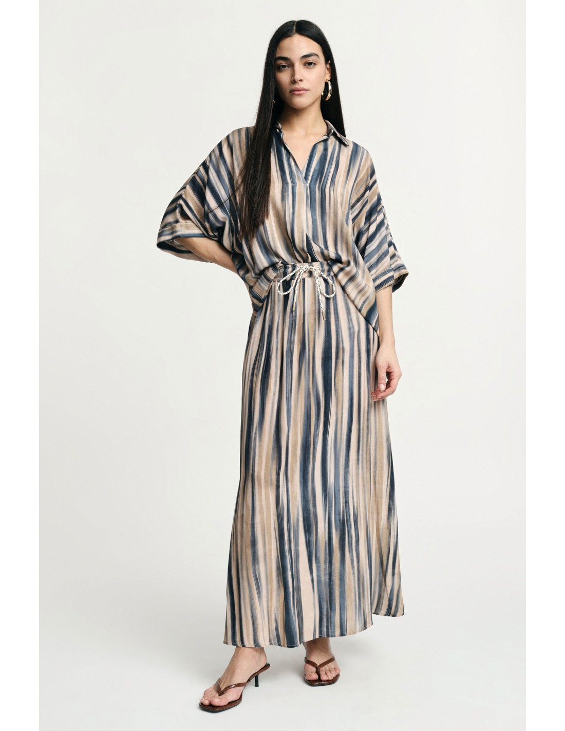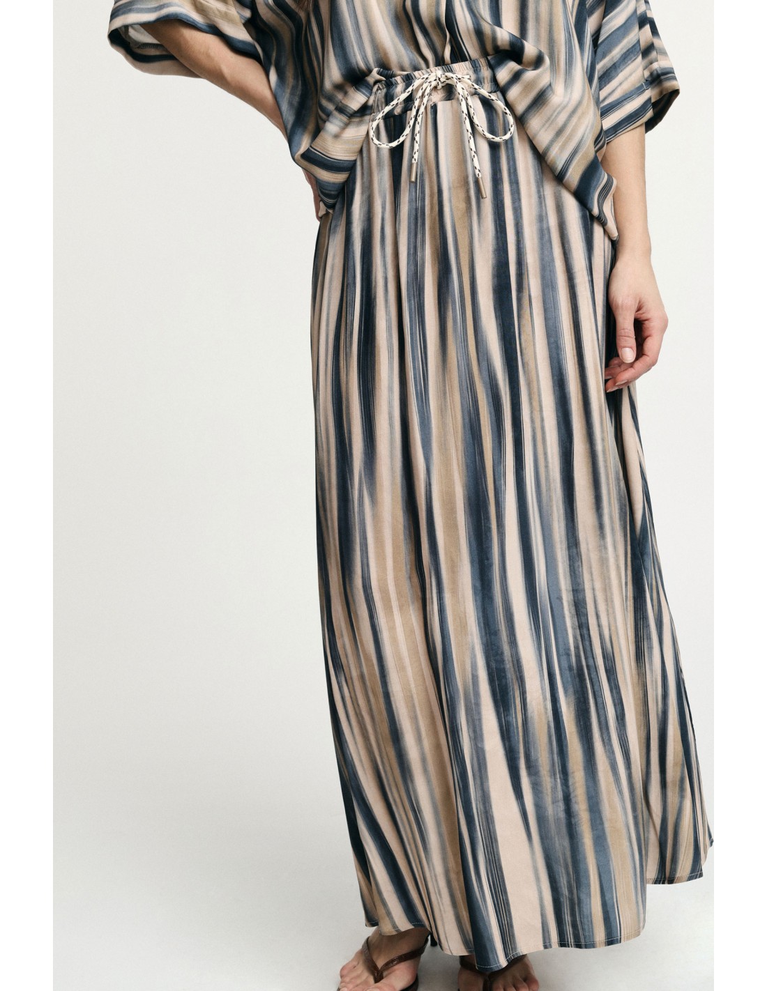 Jupe longue fluide à rayures avec taille haute et cordon ajustable.