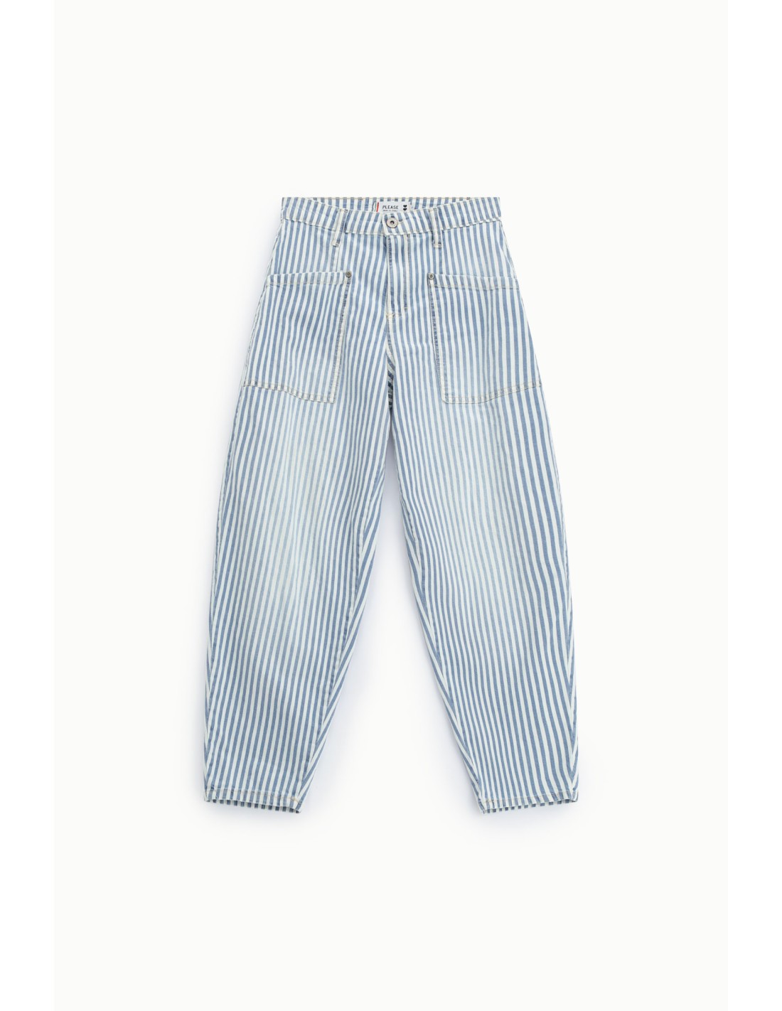 Jean ballon rayé Please Femme à l’allure forte et facile à porter, avec sa toile denim blanc et bleu délavée et légèrement usée. Coupe ample structurée type balloon, taille haute et grandes poches plaquées devant qui apportent du style et du volume. Confortable grâce à sa touche d’élasthanne, il se porte au quotidien avec un top ajusté ou une maille pour équilibrer la silhouette. Pièce fabriquée en Italie, idéale pour un look casual moderne avec du caractère.