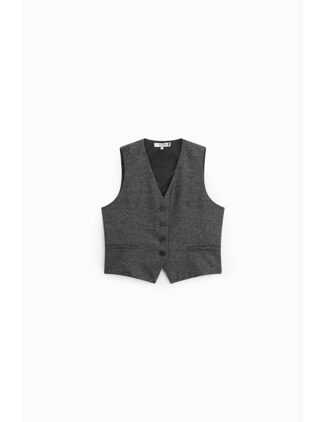 Un gilet chic et structurant qui donne tout de suite du caractère à la silhouette. Inspiré du gilet serveur, il revisite le tailoring avec une touche moderne et féminine. Son col en V, sa fermeture boutonnée et ses poches passepoilées offrent une ligne nette et élégante, tandis que la découpe au dos assure un tombé impeccable.